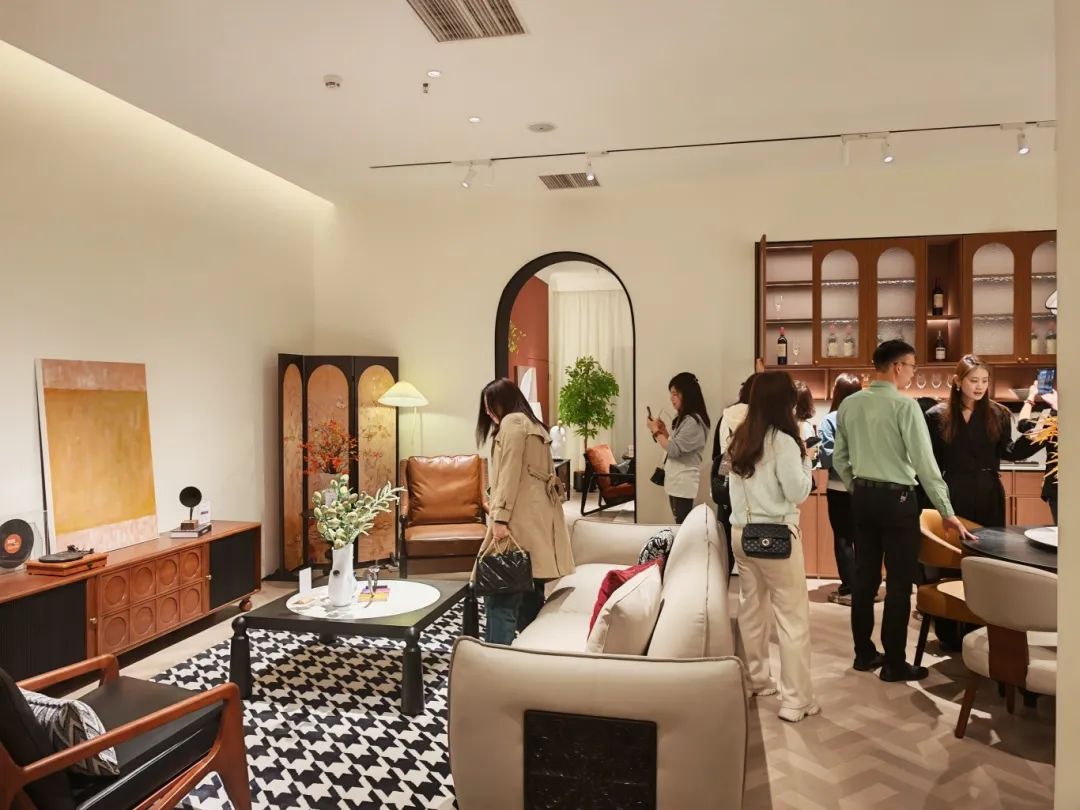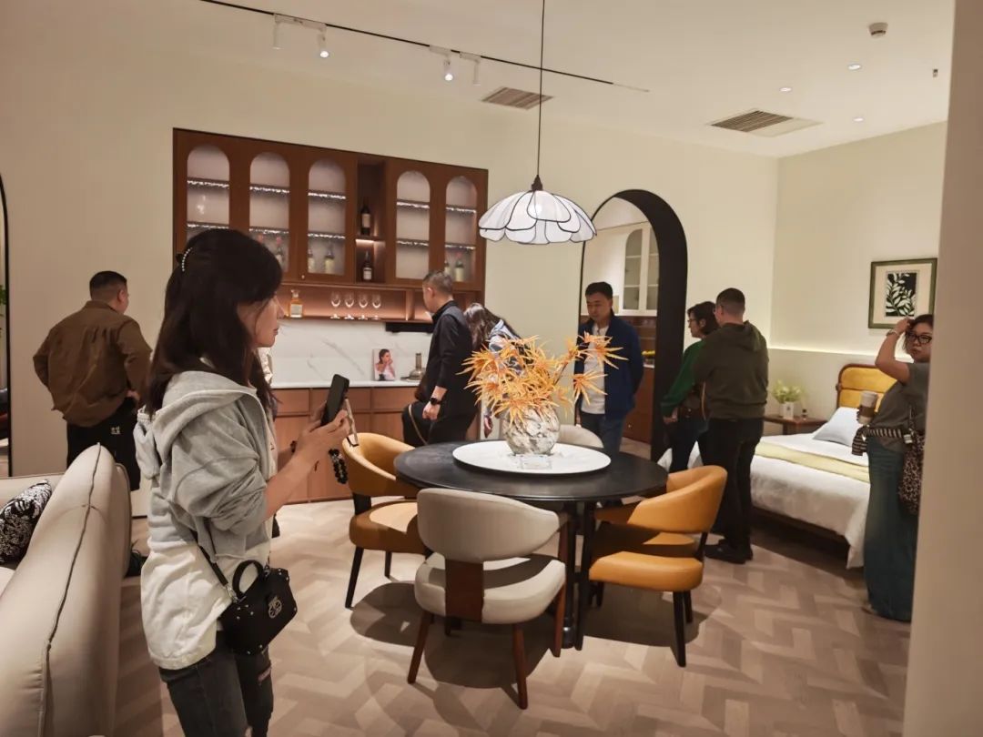 新品发布品鉴会现场,东升国际中古全案凭借独特的空间布局,创新的时尚设计,优质的材料细节以及精心的场景营造,吸引了全国优秀经销商及业界嘉宾们的目光,他们沉浸在高级的美学世界里,感受创新与品质交织的魅力。东升国际中古展厅里人潮涌动,众多经销商都对中古全案新品的创新设计称赞有加,现场签约不断,气氛热烈。
