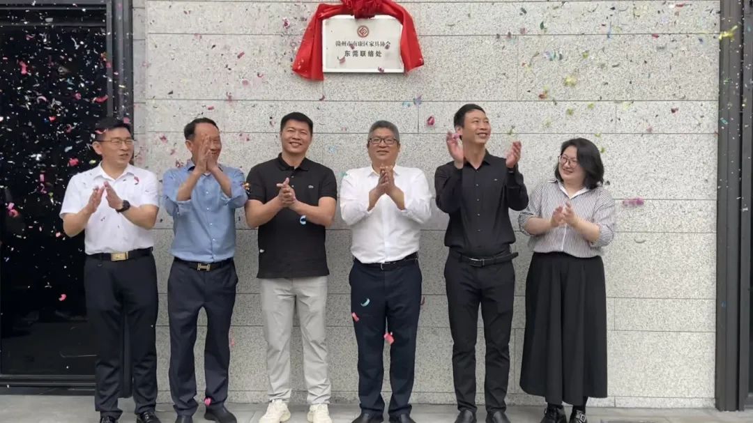 新品品鉴会期间,“南康家具协会东莞办事处”在东升国际营销中心成功挂牌。南康区委常委、常务副区长李成胜,南康家具产业促进局党委书记刘勇明,局长陈珏,副局长吴晶,南康家具协会罗海龙会长,杨剑秘书长、东升国际王健文董事长与宋迈文副总经理共同为“东莞联络处”揭牌。南康作为中国重要的家具产业集群地,在东升国际设立联络处,这标志东升国际将进一步与南康家具企业深化区域合作,整合资源,推动行业高质量发展。