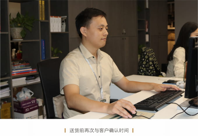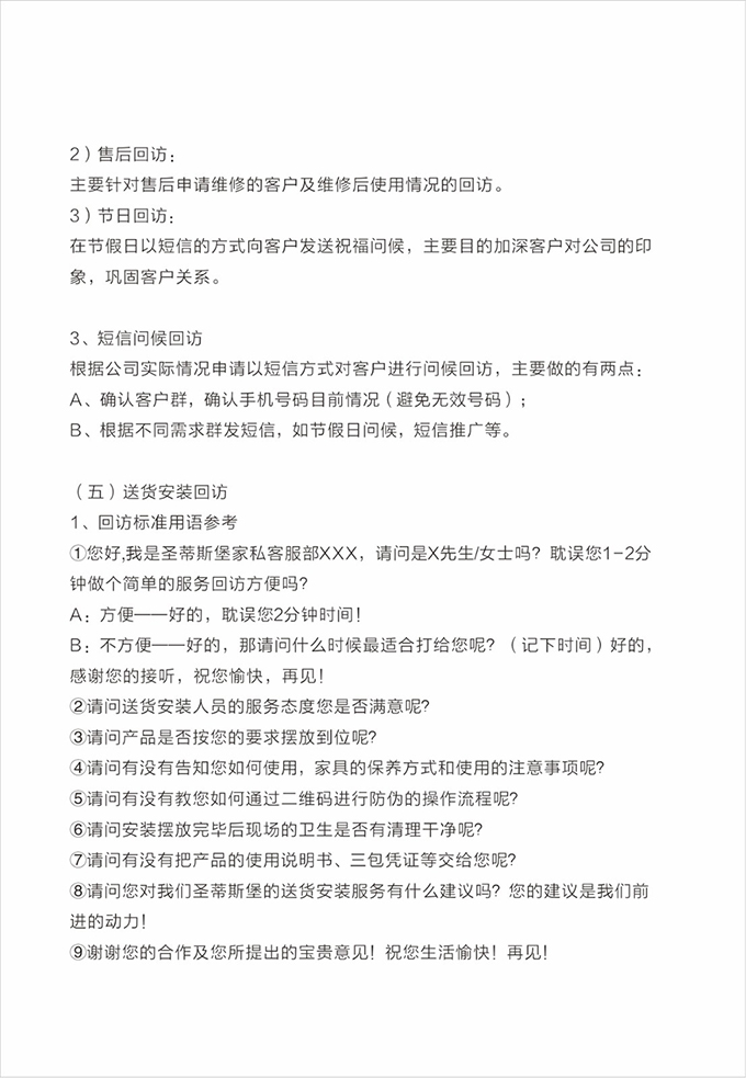 话术参考:“**先生/女士您好,我是东升国际的售后服务人员**,您购买的东升国际家具已经全部到货了,送货安装大约需要**时间,请问您这边什么时候方便我们上门送货安装呢?”同时要了解送货小区的电梯、楼道、入户门的尺寸等,提前做好准备,避免意外情况。最后确定送货时间(安装所需要时长),并告知客户安装人员的相关信息,可加微信发送,并发送配送安装流程说明。